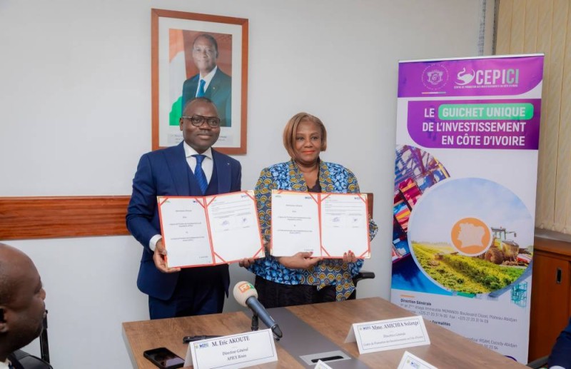 Le mercredi 21 janvier 2026, le CEPICI et l’APIEx ont signé à Abidjan un Mémorandum d’Entente pour renforcer la promotion et la facilitation des investissements entre la Côte d’Ivoire et le Bénin. La cérémonie a réuni Solange Amichia, Directrice générale du CEPICI, et Éric Akouté, Directeur général de l’APIEx, ainsi que les équipes des deux institutions.