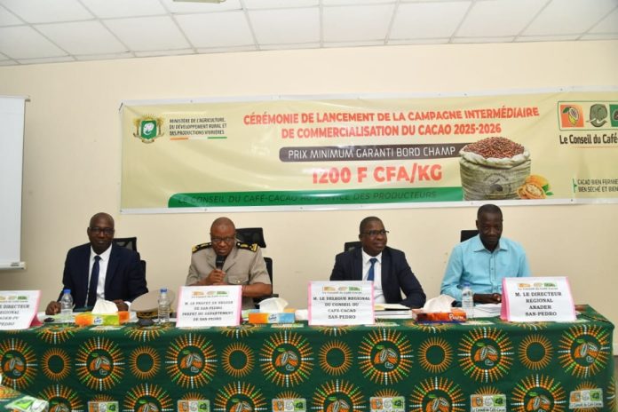 La campagne intermédiaire de commercialisation du cacao 2025-2026 a débuté le 4 mars 2026 avec un prix minimum bord champ de 1 200 F CFA/kg. Elle a été officialisée lors d’une cérémonie le 23 mars à San-Pedro, en présence des acteurs de la filière, du Corps préfectoral et des forces de sécurité.